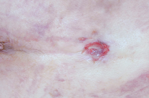| This is the skin of the lower back, with the anal cleft at the far left. Seen over the sacrum is a superficial decubitus ulcer, or "pressure sore". Such ulcerations are most likely to occur in elderly, chronically bedridden patients over bony prominences such as the sacrum. Prevention is the best therapy, with periodic repositioning of the patient and use of soft bedding materials. |