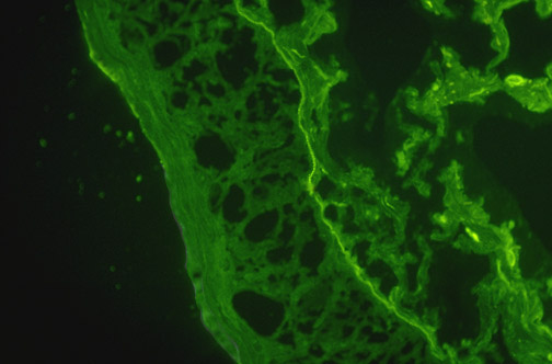 | Immunofluorescence studies can be performed on skin biopsies. Seen here is a bright green band of staining with antibody to IgG. The localization at the dermal-epidermal junction is typical, for immune complexes tend to be trapped along basement membranes. Diseases with this pattern may include systemic lupus erythematosus, discoid lupus erythematosus, and bullous pemphigoid. |