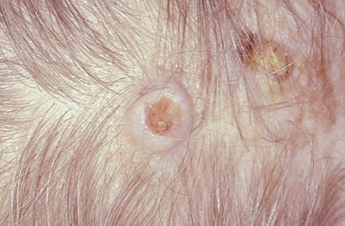 | The small nodule on the scalp seen here proved to be a squamous cell carcinoma, though a basal cell carcinoma could have a similar appearance. Such small tumors often are noticed by the patient before reaching a larger size, and the smaller, localized lesions are unlikely to have invaded far or metastasized. This is why the "cure" rate for non-melanoma skin cancers is very high. |