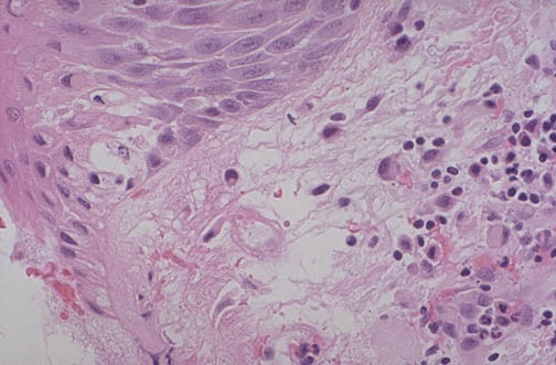 | This is the microscopic appearance of contact dermatitis, with mainly mononuclear dermal inflammatory cell infiltrates and accompanying epidermal spongiosis and dermal edema. Memory T cells migrate to the area and release cytokines to recruit additional inflammatory cells and produce the inflammatory response with local erythema and swelling. |