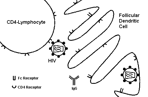 Human immunodeficiency virus, once it enters the body, is carried to the lymphoid tissues where both CD4+ T-lymphocytes as well as follicular dendritic cells can become infected, as shown in this diagram.
