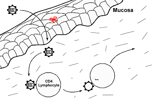 Human immunodeficiency virus is shown crossing the mucosa of the genital tract to infect CD4+ T-lymphocytes. A Langerhans cell in the epithelium is shown in red in this diagram.