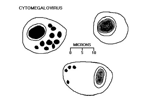 | The morphologic appearances of cytomegalovirus are diagrammed here. The cell is so large that in histologic sections, the plane of section may not reveal all or part of the nucleus in every cytomegalic cell, and the cytoplasmic inclusions, though characteristic for CMV, are not always present. |