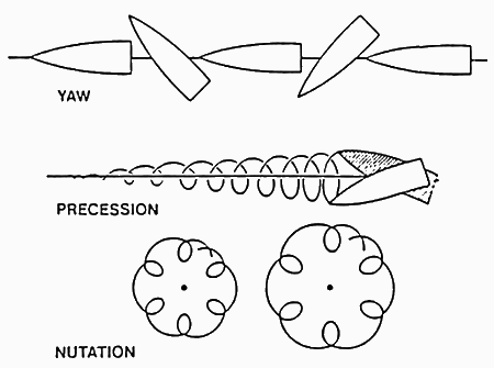 Bullets do not typically follow a straight line to the target. Rotational forces are in effect that keep the bullet off a straight axis of flight. These rotational effects are diagrammed below: