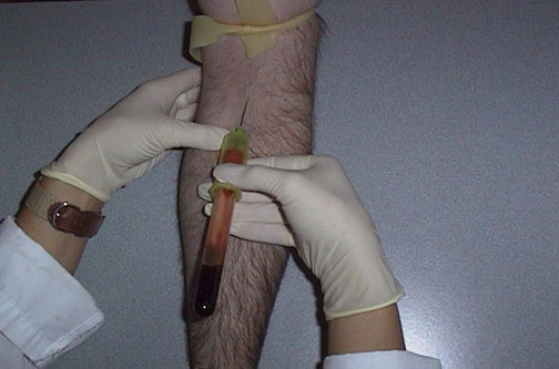 The vacutainer tube is depressed into the needle to begin drawing blood.