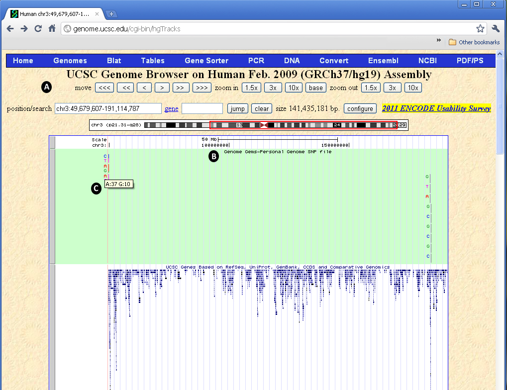 Figure 10- The UCSC Genome Browser allows the user to view the data uploaded into GenomeGems as a custom track. (A) The user can manipulate the view with options of move, zoom in, and zoom out, (B) the custom track appears at the top of the screen and can be set to hide, dense, squish, pack and full, and (C) when the user moves the mouse control over the specific SNP, the frequency of each allele is shown