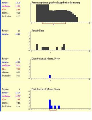 ביישומון זה ניתן לצייר כל התפלגות שהיא בחלק העליון באמצעות לחיצה מתמדת על המקש השמאלי של העכבר ותזוזה בין הצירים. לחלופין ניתן לבחור אחת מבין 3 ההתפלגויות המוצגות מראש: התפלגות נורמלית, אחידה ומוטה חיובית. לאחר בחירת צורת ההתפלגות יש לבחור ליד הגרף השלישי את הסטטיסטי הרצוי (ברירת המחדל היא ממוצע) וגודל המדגם הרצוי מ-n=5 ועד n=25 (ברירית המחדל היא 5). לאחר מכן ניתן לבחור ליד הגרף השני את צורת ההמחשה: Animated תמחיש את הדגימה בפועל מהתפלגות האוכלוסייה למעלה לפי גודל המדגם שנבחר ואז יוצג הסטטיסטי הנבחר (ממוצע המדגם) בהתפלגות הדגימה הנבנית. לחיצה על אחד המקשים: 5,1000,10000 תציג מיד לאחר מכן כמות זו של ממוצעי מדגמים בהתפלגות הדגימה. |