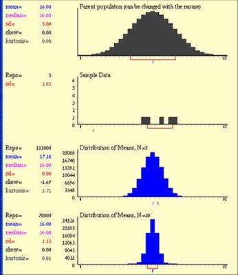 באיור הבא ניתן לראות את התפלגות הדגימה של הממוצעים מאוכלוסיה מקורית נורמלית ולהשוות את צורת ההתפלגות והפיזור השונה כאשר גודל המדגם הוא n=5 לעומת n=25 ולהשוות את התפלגות הדגימה של ממוצעים שנוצרה מדגימת מספר רב של מדגמים (הממחיש "אינסוף" מדגמים) מאוכלוסיה נורמאלית לעומת התפלגות הדגימה של ממוצעים אשר נוצרה מאוכלוסיית בצורת "נעל":